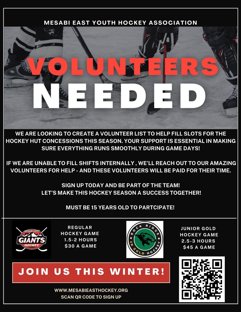 The Mesabi East Youth Hockey Association is looking for awesome individuals to help at the Hockey Hut concessions this season! Your support is vital in ensuring game days run smoothly.